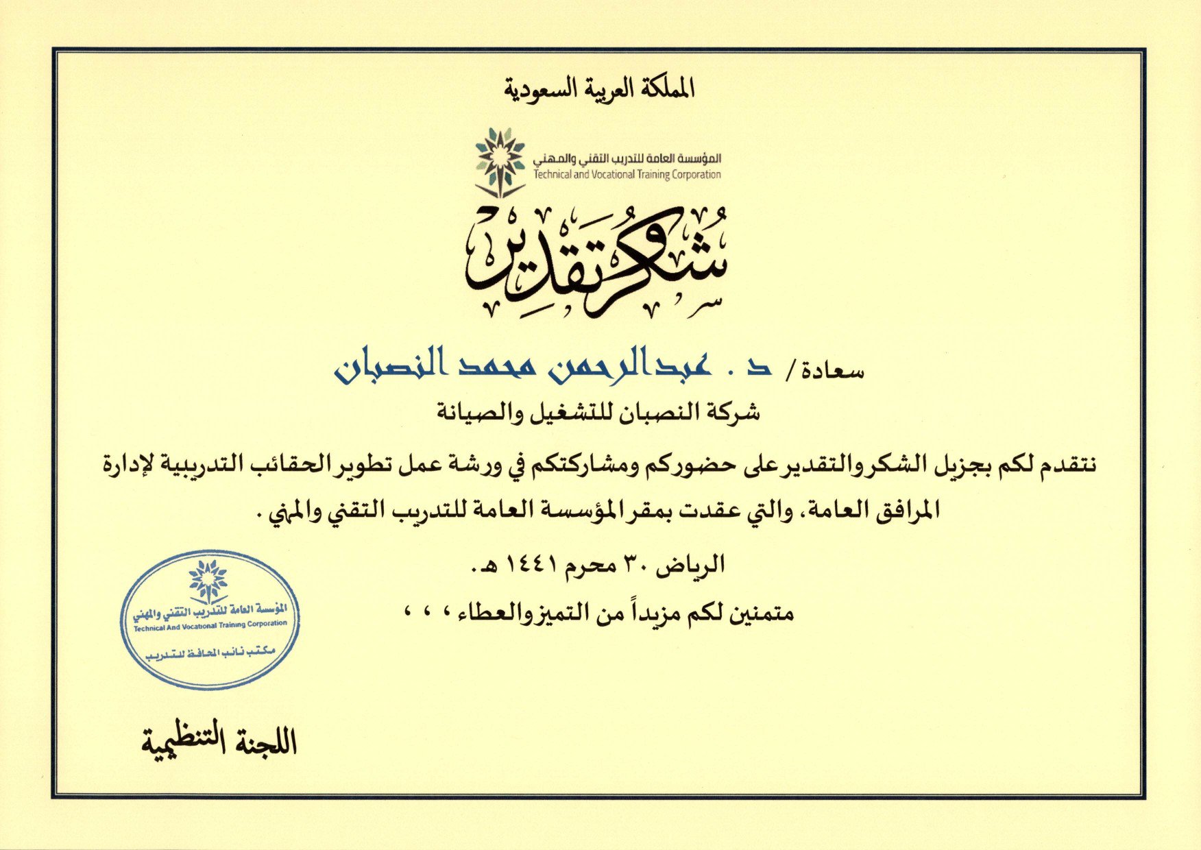 مجموعة النصبان V Twitter شهادة شكر وتقدير من المؤسسة العامة للتدريب التقني والمهني للدكتور عبدالرحمن النصبان نائب رئيس مجلس المديرين بمجموعة النصبان وذلك للحضور والمشاركة في ورشة عمل تطوير الحقائب التدريبية لإدارة
